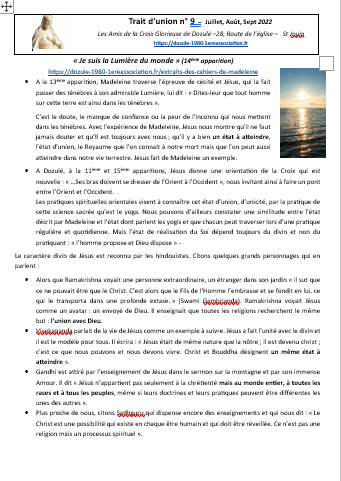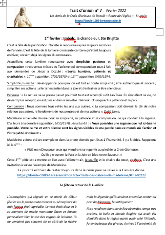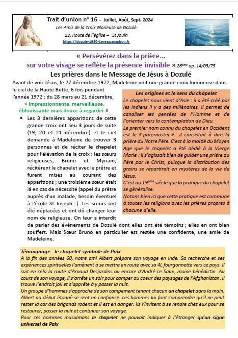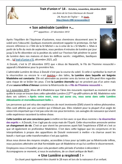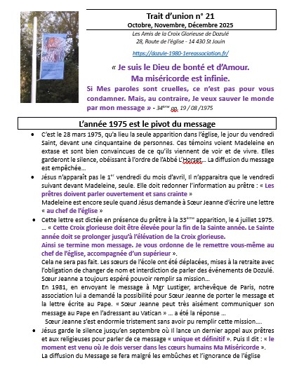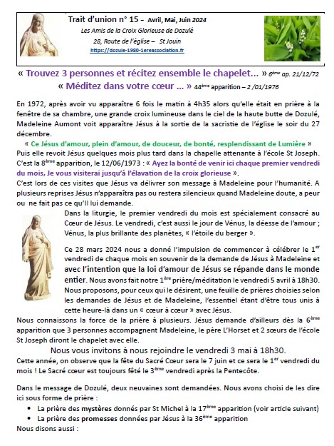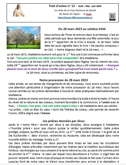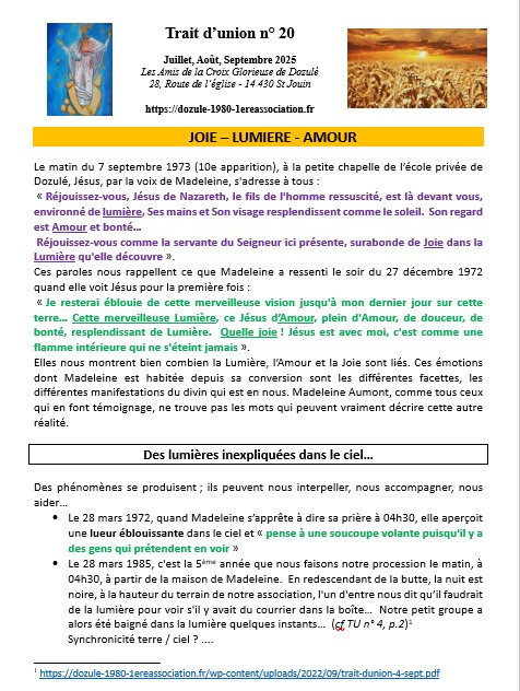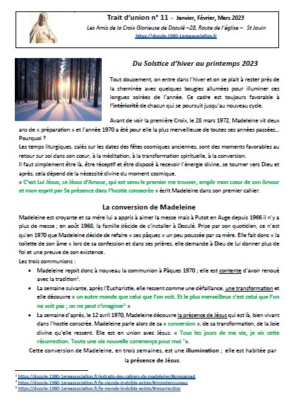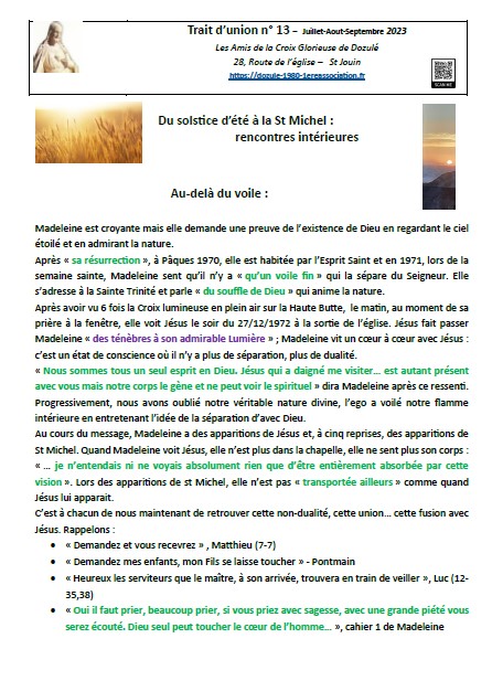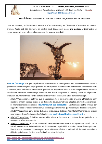 Depuis le mois de mai 2021, notre association publie régulièrement le « Trait d’union ». Nous ponctuons l’année d’une lecture du message de Jésus à Dozulé en lui donnant notre éclairage pour l’éveil des consciences. Nos différentes expériences, compétences nous amènent à faire des liens entre le message et les moments forts de l’année : solstices, équinoxes, les fêtes marquées dans nos traditions…